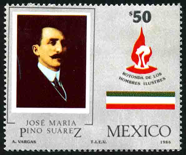 No. Scott: 1461 -- Año de Emisión: 1986 -- Valor facial: Cincuenta Pesos -- Variedad de color: Multicolor -- Perforación:14 1/2 x 14 -- Tipo de impresión: Huecograbado Timbre Postal Mexicano multicolor, del lado izquierdo de la imagen se observa el retrato José María Pino Suárez, quien fue vicepresidente de Mexico en 1911, del lado derecho aparece una llama de fuego y la silueta de un rostro humano, en la parte superior está escrito el valor facial de "50.00" y en la parte inferior la palabra "MEXICO". Para más información favor de dirigirse a biblioteca@mufi.org.mx