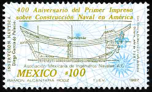 No. Scott: 1485 -- Año de Emisión: 1987 -- Valor facial: Cien Pesos -- Variedad de color: Azul, Gris, Negro y Oro -- Perforación:14 -- Tipo de impresión: Huecograbado Timbre Postal Mexicano en colores azul, gris, negro y oro, en la imagen se observa el primer impreso de un barco, elaborada con líneas cuervas y rectas, en la parte superior está escrto "400 Aniversario del Primer Impreso sobre Construcción Naval en América", en la parte inferior "MEXICO" y el valor facial de "100.00". Para más información favor de dirigirse a biblioteca@mufi.org.mx