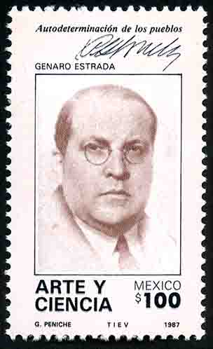 No. Scott: 1483 -- Año de Emisión: 1987 -- Valor facial: Cien Pesos -- Variedad de color: Rosa y Negro -- Perforación:14 -- Tipo de impresión: Huecograbado Timbre Postal Mexicano en colores rosa y negro, en la imagen se observa el retrato del escritor mexicano Genaro Estrada, en la parte superior está escrito "Autodeterminación de los Pueblos", en la parte inferior "ARTE Y CIENCIA", "MEXICO" y el valor facial de "100.00". Para más información favor de dirigirse a biblioteca@mufi.org.mx