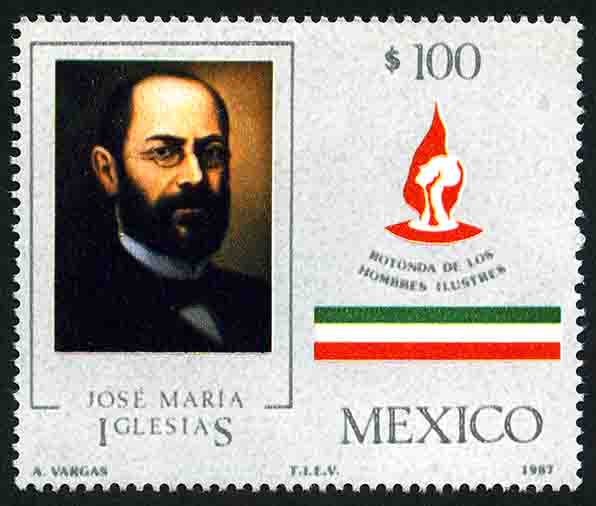No. Scott: 1472 -- Año de Emisión: 1987 -- Valor facial: Cien Pesos -- Variedad de color: Multicolor -- Perforación:14 1/2 x 14 -- Tipo de impresión: Huecograbado Timbre Postal Mexicano multicolor, del lado izquierdo de la imagen se observa el retrato de José María Iglesias, presidente de México en 1876, del lado derecho aparece una llama de fuego y la silueta de un rostro humano, en la parte superior está escrito el valor facial de "100.00" y en la parte inferior la palabra "MEXICO". Para más información favor de dirigirse a biblioteca@mufi.org.mx