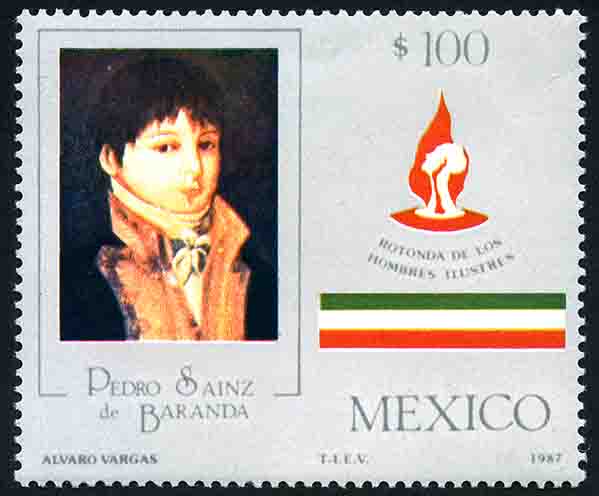 No. Scott: 1475 -- Año de Emisión: 1987 -- Valor facial: Cien Pesos -- Variedad de color: Multicolor -- Perforación:14 -- Tipo de impresión: Huecograbado Timbre Postal Mexicano multicolor del lado izquierdo de la imagen se observa el retrato de Pedro Sainz de Baranda y Borreiro, político mexicano y gobernador del Estado de Yucatán, del lado derecho aparece una llama de fuego y un rostro humano, en la parte superior está escrito el valor faciald e "100.00" y en la parte inferior la palabra "MEXICO". Para más información favor de dirigirse a biblioteca@mufi.org.mx