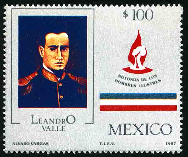 No. Scott: 1487 -- Año de Emisión: 1987 -- Valor facial: Cien Pesos -- Variedad de color: Multicolor -- Perforación:14 -- Tipo de impresión: Huecograbado Timbre Postal Mexicano multicolor, del lado izquierdo de la imagen se observa el retrato de Leandro Valle, General Liberal Mexicano, del lado derecho aparece una llama de fuego y un rostro humano, en la parte superior está escrito el valor facial de "100.00" y en la parte inferior la palabra "MEXICO". Para más información favor de dirigirse a biblioteca@mufi.org.mx