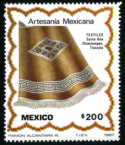 No. Scott: 1481 -- Año de Emisión: 1987 -- Valor facial: Doscientos Pesos -- Variedad de color: Multicolor -- Perforación:14 -- Tipo de impresión: Huecograbado Timbre Postal Mexicano multicolor, en la imagen se oserva una prenda de vestir diseñado con motivos prehispánicos elaborado manualmente con fibra de algodón o lana de oveja, en la parte superior está escrito ARTESANIA MEXICANA", "Textiles Santa Ana Chiautempam, Tlaxcala", en la parte inferior "MEXICO" y el valor facial de "200.00". Para más información favor de dirigirse a biblioteca@mufi.org.mx