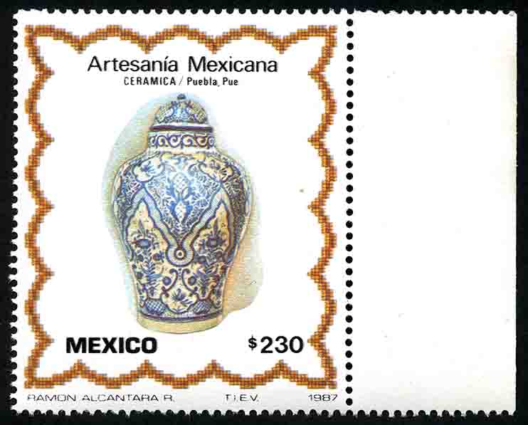 No. Scott: 1482 -- Año de Emisión: 1987 -- Valor facial: Doscientos Treinta Pesos -- Variedad de color: Multicolor -- Perforación:14 -- Tipo de impresión: Huecograbado Timbre Postal Mexicano multicolor, en la imagen se observa un jarrón de presentación lisa, decorado en su mayoría, elaborado en cerámica, en la parte superior está escrito "ARTESANIA MEXICANA", "CERAMICA / Puebla, Pue.", en la parte inferior "MEXICO" y el valor facial de "230.00". Para más información favor de dirigirse a biblioteca@mufi.org.mx