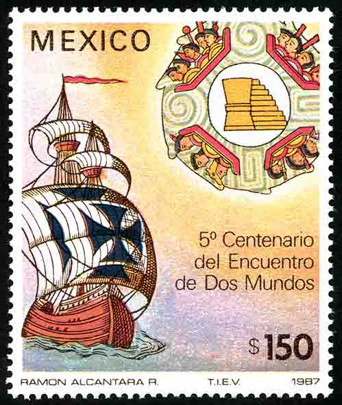 No. Scott: 1519 -- Año de Emisión: 1987 -- Valor facial: Ciento Cincuenta Pesos -- Variedad de color: Multicolor -- Perforación:14 x 14 1/2 -- Tipo de impresión: Huecograbado Timbre Postal Mexicano multicolor, del lado izquierdo de la imagen se observa una embarcación larga, alta, ligera, con una sola cubierta y tres palos con velas, también aparece un dibujo indígena, sobre la estampilla está escrito "MEXICO", "5o. Centenario del Encuentro de Dos Mundos" y el valor facial de "150.00". Para más información favor de dirigirse a biblioteca@mufi.org.mx