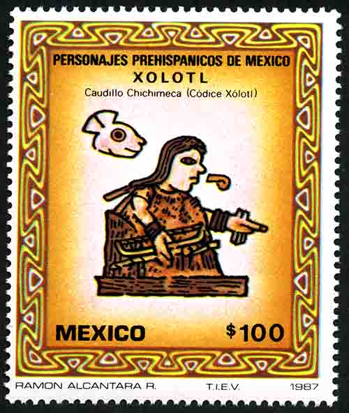 No. Scott: 1510 -- Año de Emisión: 1987 -- Valor facial: Cien Pesos -- Variedad de color: Multicolor -- Perforación:14 x 14 1/2 -- Tipo de impresión: Huecograbado Timbre Postal Mexicano multicolor, en la imagen observamos al personaje prehispánico Xólotl, Caudillo Chichimeca (Códice Xolotl), en la parte inferior está escrito "MEXICO" y el valor facial de "100.00". Para más información favor de dirigirse a biblioteca@mufi.org.mx