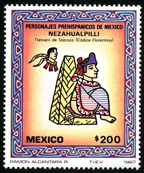 No. Scott: 1511 -- Año de Emisión: 1987 -- Valor facial: Doscientos Pesos -- Variedad de color: Multicolor -- Perforación:14 x 14 1/2 -- Tipo de impresión: Huecograbado Timbre Postal Mexicano multicolor, en la imagen observamos al personaje prehispánico Netzahuapilli, Rey de Tezcoco (Códice Florentino), en la parte inferior está escrito "MEXICO" y el valor facial de "200.00". Para más información favor de dirigirse a biblioteca@mufi.org.mx