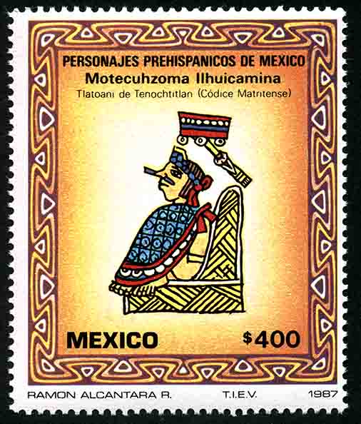 No. Scott: 1512 -- Año de Emisión: 1987 -- Valor facial: Cuatrocientos Pesos -- Variedad de color: Multicolor -- Perforación:14 x 14 1/2 -- Tipo de impresión: Huecograbado Timbre Postal Mexicano multicolor, en la imagen observamos al personaje prehispánico Moctecuhzoma IIhucamina, Rey de Tenochtitlan (Códice Matritense), en la parte inferior está escrito "MEXICO" y el valor facial de "400.00". Para más información favor de dirigirse a biblioteca@mufi.org.mx