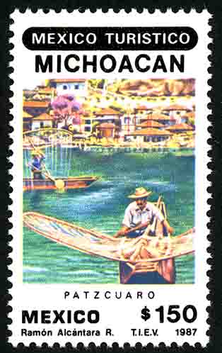 No. Scott: 1514 -- Año de Emisión: 1987 -- Valor facial: Ciento Cincuenta Pesos -- Variedad de color: Multicolor -- Perforación: 14 1/2 x 14 -- Tipo de impresión: Huecograbado Timbre Postal Mexicano Multicolor, al fondo de la imagen se observa un poblado con un gran número de casas, al frente hay una extensión de agua, sobre de ella aparecen dos personas en canoas, posiblemente estén realizando actividades de limpia o de pesca, en la parte superior está escrito "MEXICO TIRÍSTICO", "MICHOACÁN", en la parte inferior "MEXICO" y el valor facial de "150.00". Para más información favor de dirigirse a biblioteca@mufi.org.mx