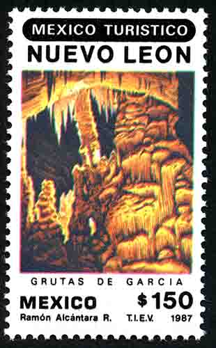 No. Scott: 1515 -- Año de Emisión: 1987 -- Valor facial: Ciento Cincuenta Pesos -- Variedad de color: Multicolor -- Perforación: 14 1/2 x 14 -- Tipo de impresión: Huecograbado Timbre Postal Mexicano Multicolor, en la imagen se observan las Grutas de García, ubicadas en el Estado de Nuevo León, en la parte superior está escrito "MEXICO TURÍSTICO" y en la parte inferior "MEXICO" y el valor facial de "150.00". Para más información favor de dirigirse a biblioteca@mufi.org.mx