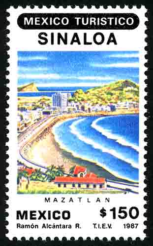 No. Scott: 1516 -- Año de Emisión: 1987 -- Valor facial: Ciento Cincuenta Pesos -- Variedad de color: Multicolor -- Perforación: 14 1/2 x 14 -- Tipo de impresión: Huecograbado Timbre Postal Mexicano Multicolor, en la imagen observamos un mar con olaje y playa, rodeada de edificios, montañas y casas, en la parte superior está escrito "MEXICO TURÍSTICO", "SINALOA", en la parte inferior "MEXICO" y el valor facial de "150.00". Para más información favor de dirigirse a biblioteca@mufi.org.mx