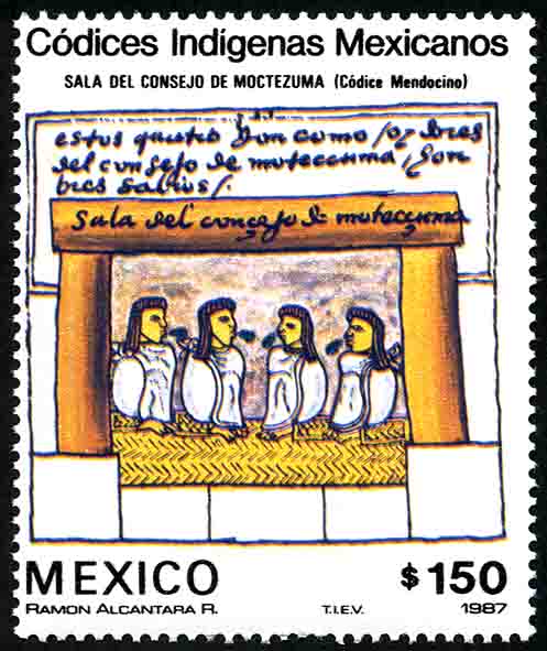 No. Scott: 1522 -- Año de Emisión: 1987 -- Valor facial: Ciento Cincuenta Pesos -- Variedad de color: Multicolor -- Perforación: 14 x 14 1/2 -- Tipo de impresión: Huecograbado Timbre Postal Mexicano multicolor , al fondo de la imagen se observan a cuatro personas indígenas sentadas sobre un tapete, al frente aparece un marco con el título "Sala de Consejo de Moctezuma", en la parte superior está escrito "Códices Indígenas Mexicanos y en la parte inferior "MEXICO" y el valor facial de "150.00". Para más información favor de dirigirse a biblioteca@mufi.org.mx
