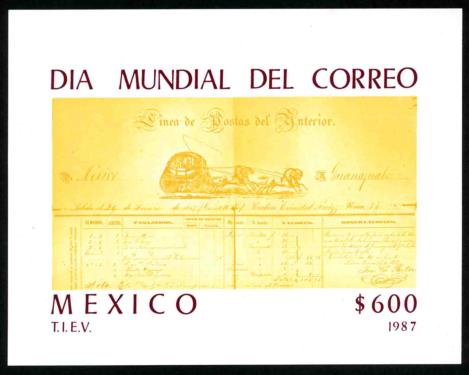No. Scott: 1526 -- Año de Emisión: 1987 -- Valor facial: Seiscientos Pesos -- Variedad de color: Amarillo y Carmín -- Tipo de impresión: Huecograbado Hoja Recuerdo en colores amarillo y carmín, en la imagen se observa una diligencia en movimiento, arrastrada por cuatro caballos, más abajo aparecen líneas rectas formando una especie de cuadros con palabras y números poco legibles, en la parte supereior está escrito "DIA MUNDIAL DEL CORREO", en la aprte inferior "MEXICO" y el valor facial de "600.00". Para más información favor de dirigirse a biblioteca@mufi.org.mx