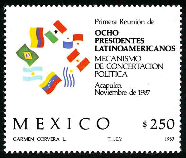 No. Scott: 1527 -- Año de Emisión: 1987 -- Valor facial: Doscientos Cincuenta Pesos -- Variedad de color: Multicolor -- Perforación: 14 1/2 x 14 -- Tipo de impresión: Huecograbado Timbre Postal Mexicano multicolor, en el lado izquierdo de la imagen se observan ocho banderas de los países de Argentina, Brasil, Colombia, México Panamá, Perú, Uruguay y Venezuela, en el lado derecho está escrito "Primera Reunión de OCHO PRESIDENTES LATINOAMERICANOS, MECANISMO DE CONCERTACIÓN POLITICA, Acapulco, Noviembre de 1987", en la parte inferior "MEXICO" y el valor facial de "250.00". Para más información favor de dirigirse a biblioteca@mufi.org.mx