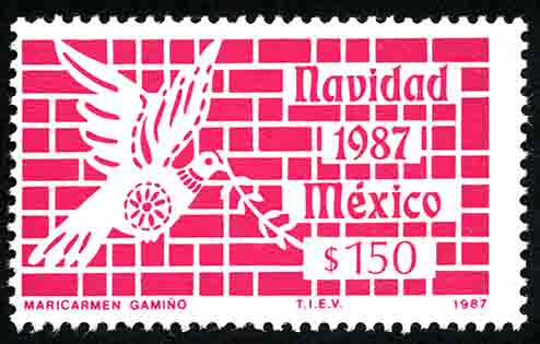 No. Scott: 1523 -- Año de Emisión: 1987 -- Valor facial: Ciento Cincuenta Pesos -- Variedad de color: Rosa -- Perforación: 14 -- Tipo de impresión: Huecograbado Timbre Postal Mexicano en color rosa, al fondo de la imagen se observa una pared elaborada de cuadros y rectángulos, en la parte frontal del lado izquierdo hay una paloma y del lado derecho está escrito "NAVIDAD 1987", "MEXICO" y el valor facial de "150.00". Para más información favor de dirigirse a biblioteca@mufi.org.mx