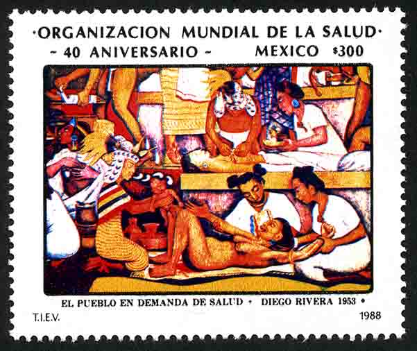 No. Scott: 1539 -- Año de Emisión: 1988 -- Valor facial: Trescientos Pesos -- Variedad de color: Multicolor -- Perforación: 14 -- Tipo de impresión: Huecograbado Timbre Postal Mexicano multicolor, en la imagen se observa una parte del mural de Diego Rivera, titulado "El Pueblo en demanda de Salud, en él hace alusión a la medicina prehispánica en el cual se exhiben curaciones , fracturas, partos y curaciones de corazón, en la parte superior está escrito "ORGANIZACIÓN MUNDIAL DE LA SALUD", "40 ANIVERSARIO", "MEXICO" y el valor facial de "300.00". Para más información favor de dirigirse a biblioteca@mufi.org.mx