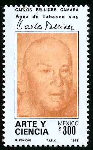 No. Scott: 1544 -- Año de Emisión: 1988 -- Valor facial: Trescientos Pesos -- Variedad de color: Café y Azul Negro -- Perforación: 14 -- Tipo de impresión: Huecograbado Timbre Postal Mexicano en colores café y azul negro, en la imagen se observa el retrato del poeta Carlos Pollicer Cámara, elaborado por Fontanelly, en la parte inferior está escrito "ARTE Y CIENCIA", "MEXICO" y el valor facial de "300.00". Para más información favor de dirigirse a biblioteca@mufi.org.mx