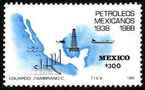No. Scott: 1535 -- Año de Emisión: 1988 -- Valor facial: Trescientos Pesos -- Variedad de color: Azul y Negro -- Perforación: 14 -- Tipo de impresión: Huecograbado Timbre Postal Mexicano en colores azul y negro , al fondo de la imagen aparece un mapa de México, también se observa un barco, una torre y un helicóptero en vuelo, en la parte frontal hay una refinería de petroleo, en la parte superior del lado derecho está escrito "PETROLEOS MEXICANOS 1938-1988", en la parte inferior "MEXICO" y el valor facial de "300.00" Para más información favor de dirigirse a biblioteca@mufi.org.mx
