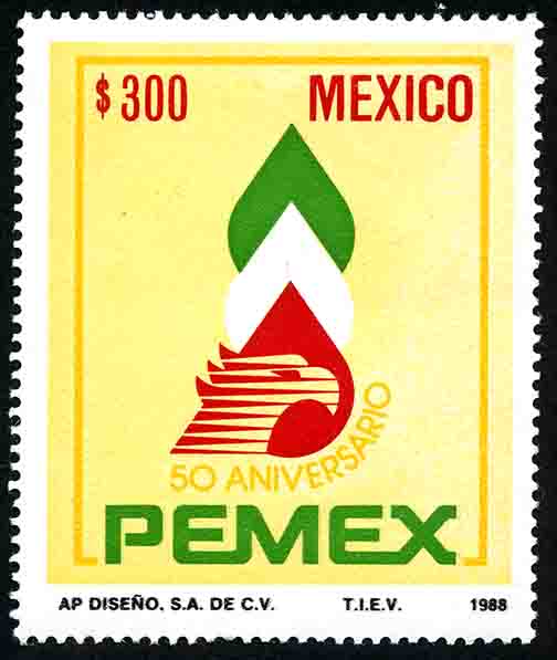 No. Scott: 1536 -- Año de Emisión: 1988 -- Valor facial: Trescientos Pesos -- Variedad de color: Amarillo, Rojo y Verde -- Perforación: 14 -- Tipo de impresión: Huecograbado Timbre Postal Mexicano en colores amarillo, rojo y verde, en la imagen se observa el emblema de PEMEX ( Petróleos Mexicanos) representado por tres gotas de petróleo y el perfil de un águila real como elemento nacional, en la parte superior está escrito el valor facial de "300.00", "MEXICO", en la parte inferior "50 ANIVERSARIO" y "PEMEX". Para más información favor de dirigirse a biblioteca@mufi.org.mx