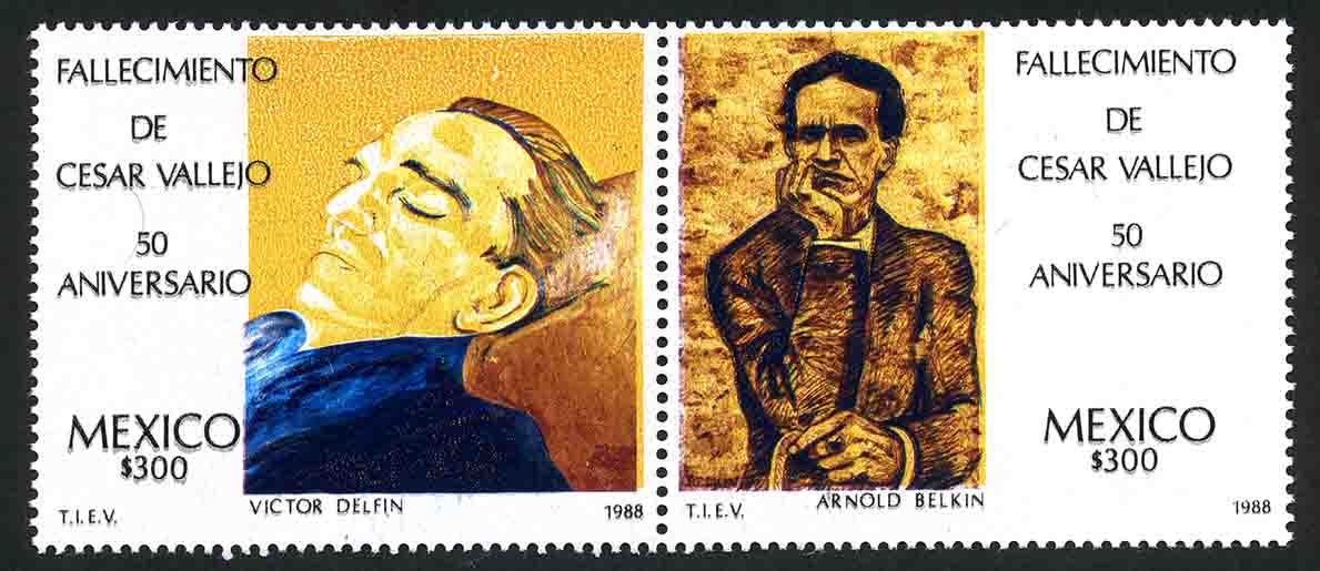 No. Scott: 1541-a -- Año de Emisión: 1988 -- Valor facial: Trescientos Pesos -- Variedad de color: Multicolor -- Perforación: 14 -- Tipo de impresión: Huecograbado Timbre Postal Mexicano multicolor, en las imagenes se observa al Poeta Peruano César Vallejo, del lado izquierdo el permanece en reposo, posiblemente este durmiendo, del lado derecho está sentado, se aprecia pensativo, tiene una mano sobre la quijada y la otra puede que este sobre su pierna, en ambas estampillas está escrito "FALLECIMIENTO DE CÉSAR VALLEJO, 50 ANIVERSARIO ", "MEXICO" y el valor facial de "300.00". Para más información favor de dirigirse a biblioteca@mufi.org.mx