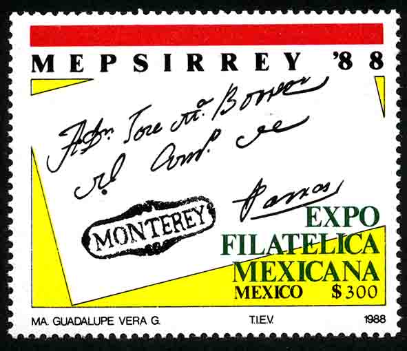 No. Scott: 1546 -- Año de Emisión: 1988 -- Valor facial: Trescientos Pesos -- Variedad de color: Amarillo, Negro, Verde y Rojo -- Perforación: 14 -- Tipo de impresión: Huecograbado Timbre Postal Mexicano en colores amarillo, negro, verde y rojo, en la imagen se observa una carta escrita a mano, tiene un sello de cancelación que dice "MONTERREY", en la parte superior está escrito "MEPSIRREY 88", mas abajo "EXPO FILATÉLICA MEXICANA", en la parte inferior "MEXICO" y el valor facial de "300.00". Para más información favor de dirigirse a biblioteca@mufi.org.mx