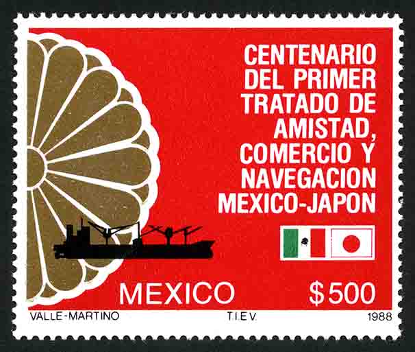 No. Scott: 1552 -- Año de Emisión: 1988 -- Valor facial: Quinientos Pesos -- Variedad de color: Rojo, Oro, Negro y Verde -- Perforación: 14 -- Tipo de impresión: Huecograbado Timbre Postal Mexicano en colores rojo, oro, negro y verde, en la imagen se observa parte del emblema del sol naciente y un barco mercante, así como las banderas de México y Japón, tambión está escrito "CENTENARIO DEL PRIMER TRATADO DE AMISTAD, COMERCIO Y NAVEGACIÓN MEXICO-JAPÓN", "MEXICO" y el valor facial de "500.00". Para más información favor de dirigirse a biblioteca@mufi.org.mx
