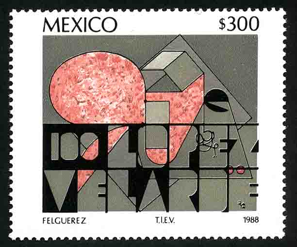 No. Scott: 1549 -- Año de Emisión: 1988 -- Valor facial: Trescientos Pesos -- Variedad de color: Multicolor -- Perforación: 14 -- Tipo de impresión: Huecograbado Timbre Postal Mexicano multicolor, en la imagen se observa una pintura alusica al poeta realizada por el pintor Felguerez, en la cual se lee "100 LOPEZ VELARDE", en la parte superior está escrito "MEXICO" y el valor facial de "300.00". Para más información favor de dirigirse a biblioteca@mufi.org.mx