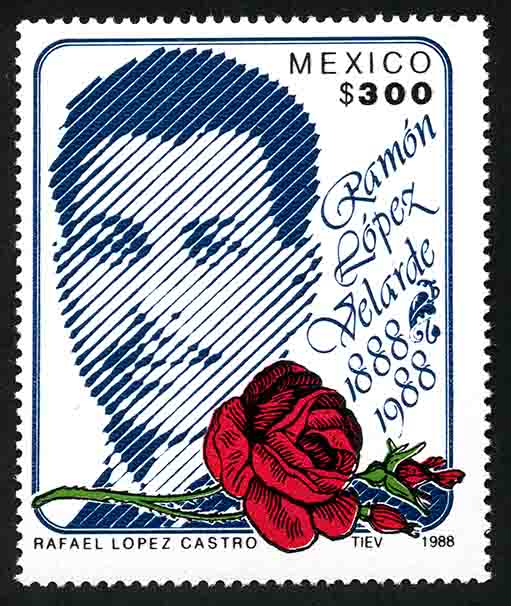 No. Scott: 1550 -- Año de Emisión: 1988 -- Valor facial: Trescientos Pesos -- Variedad de color: Multicolor -- Perforación: 14 -- Tipo de impresión: Huecograbado Timbre Postal Mexicano multicolor, al fondo de la imagen se observa el retrato del poeta Ramón López Velarde, elaborado con líneas gruesas y delgadas, al frente, hay una flor (rosa) con dos botones, en la parte lateral del lado izquierdo está escrito "MEXICO", el valor facial de "300.00" y "Ramón López Velarde 1888-1988". Para más información favor de dirigirse a biblioteca@mufi.org.mx