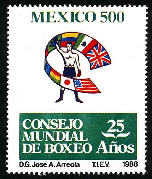 No. Scott: 1556 -- Año de Emisión: 1988 -- Valor facial: Quinientos Pesos -- Variedad de color: Multicolor -- Perforación: 14 -- Tipo de impresión: Huecograbado Timbre Postal Mexicano multicolor, en el centro de la imagen se observa a un joven deportista, por la vestimenta que utiliza, considero que es un boxeador, alrederor de él, aparecen muchas banderas del mundo en forma de semi círculo, en la parte superior está escrito "MEXICO", el valor facial de "500.00" y en la parte inferior "CONSEJO MUNDIAL DE BOXEO", "25 AÑOS". Para más información favor de dirigirse a biblioteca@mufi.org.mx