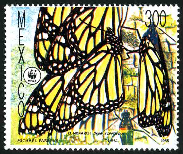 No. Scott: 1559 -- Año de Emisión: 1988 -- Valor facial: Trescientos Pesos -- Variedad de color: Multicolor -- Perforación: 14 x 14 1/2 -- Tipo de impresión: Huecograbado Timbre Postal Mexicano multicolor, en la imagen se observa un grupo de pequeños insectos color naranja, con alas y bordes negros, decorados con motitas blancas, en la parte lateral del lado izquierdo está escrito "MEXICO" y del lado derecho el valor facial de "300.00". Para más información favor de dirigirse a biblioteca@mufi.org.mx