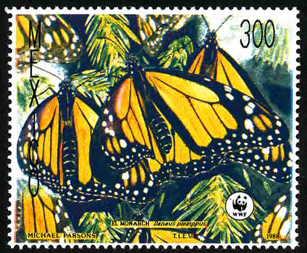 No. Scott: 1560 -- Año de Emisión: 1988 -- Valor facial: Trescientos Pesos -- Variedad de color: Multicolor -- Perforación: 14 x 14 1/2 -- Tipo de impresión: Huecograbado Timbre Postal Mexicano multicolor, en la imagen se observan tres pequeños insectos color naranja brillante, con alas y bordes negros, decorados con motitas blancas, en la parte lateral del lado izquierdo está escrito "MEXICO" y del lado derecho el valor facial de "300.00". Para más información favor de dirigirse a biblioteca@mufi.org.mx