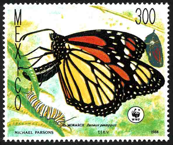 No. Scott: 1561 -- Año de Emisión: 1988 -- Valor facial: Trescientos Pesos -- Variedad de color: Multicolor -- Perforación: 14 x 14 1/2 -- Tipo de impresión: Huecograbado Timbre Postal Mexicano multicolor, en la imagen se observa un pequeños insectos color amarillo y naranja brillante, con alas y bordes negros, decorados con motitas blancas, en la parte lateral del lado izquierdo está escrito "MEXICO" y del lado derecho el valor facial de "300.00". Para más información favor de dirigirse a biblioteca@mufi.org.mx