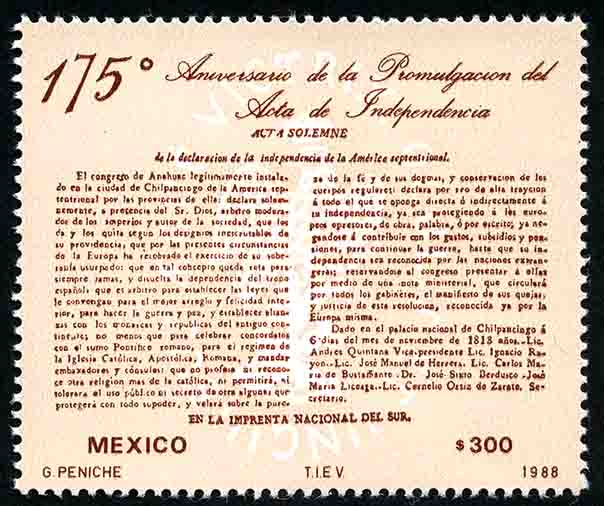 No. Scott: 1570 -- Año de Emisión: 1988 -- Valor facial: Trescientos Pesos -- Variedad de color: Ante y Café -- Perforación: 14 1/2 x 14 -- Tipo de impresión: Huecograbado Timbre Postal Mexicano en colores ante y café, en la imagen se observa un texto del Acta Solemne de la Declaración de la Independencia de la América Septentrional, en la parte superior está escrito "175 Aniversario de la Promulgación del Acta de Independencia, en la parte inferior "MEXICO" y el valor facial de "300.00". Para más información favor de dirigirse a biblioteca@mufi.org.mx