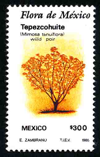 No. Scott: 1578 -- Año de Emisión: 1988 -- Valor facial: Trescientos Pesos -- Variedad de color: Amarillo Rojizo y Negro -- Perforación:14 1/2 x 14 -- Tipo de impresión: Huecograbado Timbre Postal Mexicano multicolor, en la imagen se observa un árbol de corteza color amarillo rojizo, no se ve muy alto, ni frondozo, sus hojas se aprecian cortas y erectas, en la parte superior está escrito "Flora de México", "Tepezcohuite", en la parte inferior "MEXICO" y el valor facial de "300.00". Para más información favor de dirigirse a biblioteca@mufi.org.mx