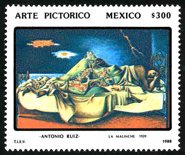 No. Scott: 1572 -- Año de Emisión: 1988 -- Valor facial: Trescientos Pesos -- Variedad de color: Multicolor -- Perforación:14 -- Tipo de impresión: Huecograbado Timbre Postal Mexicano multicolor, en la imagen se observa la obra del pintor Antonio M. Ruíz, titulada "La Maliche", en la cual aparece una mujer dormida en una cama, con una pared oscura y una manta dibujada a su alrededor, en la manta hay un paisaje con un templo religioso, en la parte superior está esccrito "ARTE PICTÓRICO", "MEXICO" y el valor facial de "$300". Para más información favor de dirigirse a biblioteca@mufi.org.mx