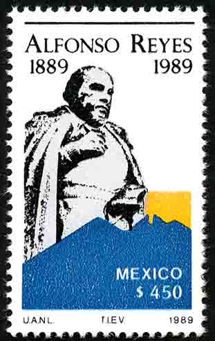 No. Scott: 1611 -- Año de Emisión: 1989 -- Valor facial: Cuatrocientos Cincuenta Pesos -- Variedad de color: Azul, Gris, Negro y Amarillo -- Perforación:14 -- Tipo de impresión: Huecograbado Timbre Postal Mexicano en colores azul, gris, negro y amarillo, en la imagen se observa un monumento histórico alusivo a Alfonso Reyes, poeta, ensayista, narrador y pensador de México, en la parte superior está escrito "ALFONSO REYES 1889-1989", en la parte inferior "MEXICO" y el valor facial de "450.00". Para más información favor de dirigirse a biblioteca@mufi.org.mx