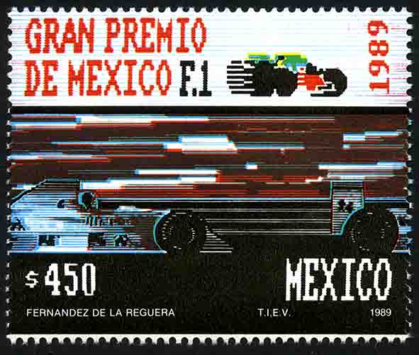 No. Scott: 1612 -- Año de Emisión: 1989 -- Valor facial: Cuatrocientos Cincuenta Pesos -- Variedad de color: Negro, Rojo, Verde, Azul y Café -- Perforación:14 -- Tipo de impresión: Huecograbado Timbre Postal Mexicano en colores negro, rojo, verde, azul y café, alusivo al Gran Premio de México F1, año 1989, en la imagen se observan las llantas de un auto y muchas líneas rectas en diferentes colores, al fondo, en mi opinión aparece una área de escalones, en la parte inferior está escrito el valor facial de "450.00" y "MEXICO". Para más información favor de dirigirse a biblioteca@mufi.org.mx