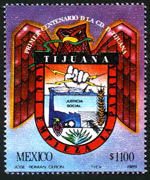 No. Scott: 1620 -- Año de Emisión: 1989 -- Valor facial: Mil Cien Pesos -- Variedad de color: Multicolor -- Perforación:14 -- Tipo de impresión: Huecograbado Timbre Postal Mexicano multicolor, en la imagen se observa el Escudo de Armas de la ciudad de Tijuana representado por un águila con una serpiente en el pico, una mano humana proyectando un rayo de luz, un campo de siembra representado por zurcos y plantas que evocan la agricultura, en la parte superior está escrito "PRIMER CENTENARIO DE LA CIUDAD DE TIJUANA", en la parte inferior "MEXICO" y el valor facial de "$1.100". Para más información favor de dirigirse a biblioteca@mufi.org.mx