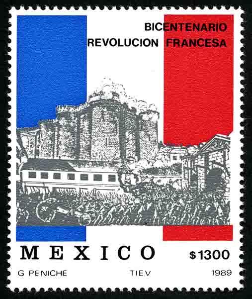 No. Scott: 1621 -- Año de Emisión: 1989 -- Valor facial: Mil Cien Pesos -- Variedad de color: Gris, Azul, Rojo y Negro -- Perforación:14 -- Tipo de impresión: Huecograbado Timbre Postal Mexicano en colores gris, azul, rojo y negro, al fondo de la imagen se observan los colores de la bandera de Francia, al frente aparece un edificio con grandes murallas o torres y una gran multitud de personas en la parte superior está escrito "BICENTENARIO REVOLUCION FRANCESA", en la parte inferior "MEXICO" y el valor facial de "$1.300". Para más información favor de dirigirse a biblioteca@mufi.org.mx