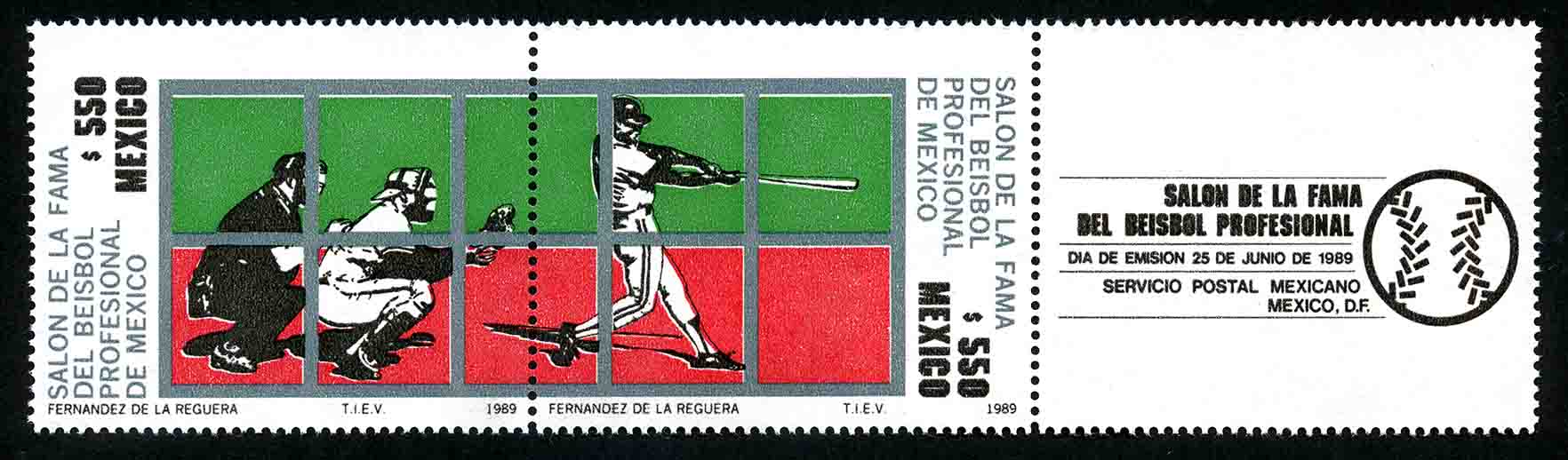 No. Scott: 1617-a -- Año de Emisión: 1989 -- Valor facial: Mil Cien Pesos -- Variedad de color: Verde, Rojo, Negro y Gris -- Perforación:14 -- Tipo de impresión: Huecograbado Dos Timbres Postales Mexicanos, más etiqueta en colores verde, rojo, negro y gris, en la imagen aparecen tres hombres jugando béisbol, el primero de izquierda a derecha es el Ampayer, en medio está el Catcher y adelante el Bateador, en cada timbre aparece la leyenda "SALON DE LA FAMA DEL BEISBOL PROFESIONAL DE MEXICO, el valor facial de "$550" y "MEXICO". Para más información favor de dirigirse a biblioteca@mufi.org.mx