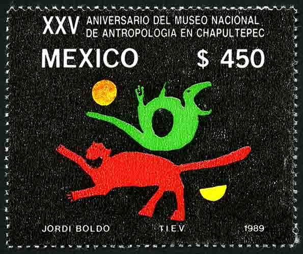 Timbre Postal Mexicano en colores negro, rojo, verde y amarillo en la imagen se observa un fragmento del mural "Dualidad " del pintor Rufino Tamayo, en el cual aparece una serpiente, un jaguar, el sol y la luna, en la parte superior está escrito "XXV ANIVERSARIO DEL MUSEO NACIONAL DE ANTROPOLOGÍA EN CHAPULTEPEC", "MEXICO" y el valor facial de "$450". Para más información favor de dirigirse a biblioteca@mufi.org.mx No. Scott: 1623 -- Año de Emisión: 1989 -- Valor facial: Cuatrocientos Cincuenta Pesos -- Variedad de color: Negro, Rojo, Verde y Amarillo -- Perforación:14 x 14 1/2 -- Tipo de impresión: Huecograbado