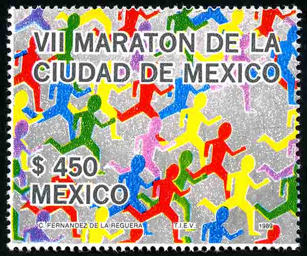 No. Scott: 1624 -- Año de Emisión: 1989 -- Valor facial: Cuatrocientos Cincuenta Pesos -- Variedad de color: Multicolor -- Perforación:14 x 14 1/2 -- Tipo de impresión: Huecograbado Timbre Postal Mexicano multicolor, en la imagen se observan un gran número de siluetas humanas en carrera y de diferentes colores, en la parte superior aparece escrito "VII MARATON DE LA CIUDAD DE MEXICO", en la parte inferior del lado izquierdo, el valor facial de "$450" y la palabra "MEXICO". Para más información favor de dirigirse a biblioteca@mufi.org.mx