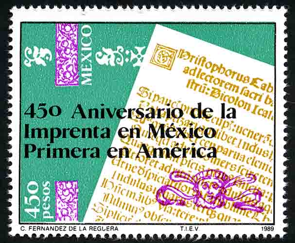 No. Scott: 1625 -- Año de Emisión: 1989 -- Valor facial: Cuatrocientos Cincuenta Pesos -- Variedad de color: Verde, Sepia, Magenta y Negro -- Perforación:14 1/2 x 14 -- Tipo de impresión: Huecograbado Timbre Postal Mexicano en colores verde, sepia, magenta y negro, en la imagen se observa, parte de la primera impresión tipográfica realizada en México, en la parte superior está escrito "MEXICO", en medio "450 Aniversario de la Imprenta en México Primera en América" y en la parte inferior el valor facial de "$450". Para más información favor de dirigirse a biblioteca@mufi.org.mx