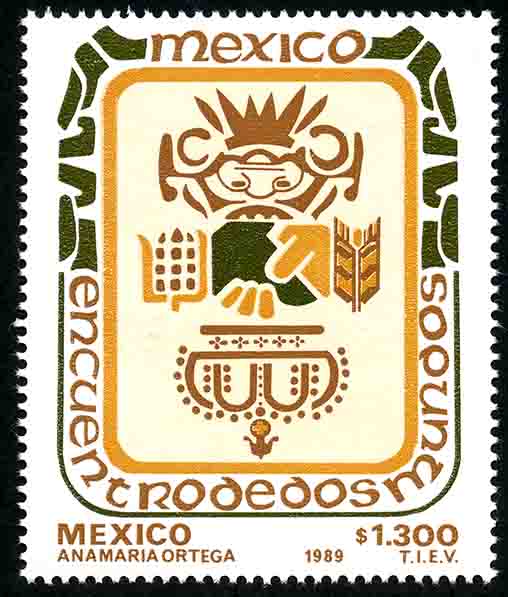 No. Scott: 1628 -- Año de Emisión: 1989 -- Valor facial: Mil Trescientos Pesos -- Variedad de color: Beige, Café, Verde Olivo -- Perforación:14 -- Tipo de impresión: Huecograbado Timbre Postal Mexicano en colores beige, café y verde olivo, en la imagen se observan símbolos de la exploración y colonización del Encuentro de Dos Mundos, en la parte inferior está escrito "MEXICO" y el valor facial de "$1.300". Para más información favor de dirigirse a biblioteca@mufi.org.mx
