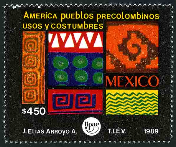 No. Scott: 1629 -- Año de Emisión: 1989 -- Valor facial: Cuatrocientos Cincuenta Pesos -- Variedad de color: Multicolor -- Perforación:14 -- Tipo de impresión: Huecograbado Timbre Postal Mexicano multicolor, en la imagen se observa una muestra de arte precolombino, en la cual aparece un mozaico, con una gran variedad de grecas y colores, en la parte superior está escrito "América Pueblos Precolombinos Usos y Costumbres", en la parte inferior "MEXICO" y el valor facial de "$450". Para más información favor de dirigirse a biblioteca@mufi.org.mx