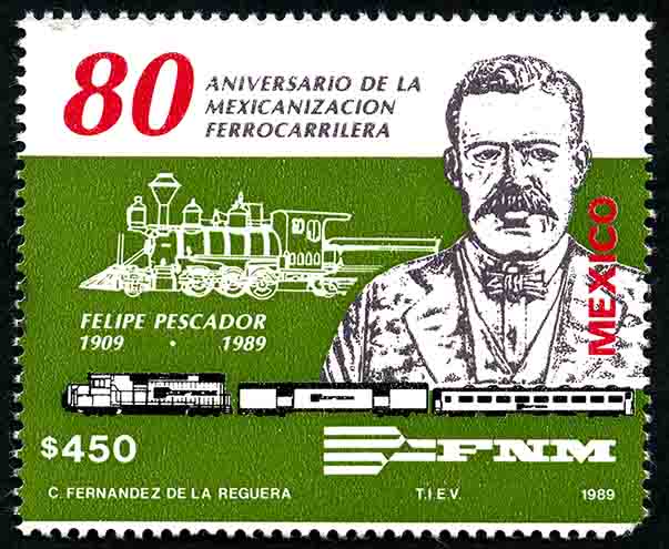 No. Scott: 1638 -- Año de Emisión: 1989 -- Valor facial: Cuatrocientos Cincuenta Pesos -- Variedad de color: Verde, Negro y Rojo -- Perforación:14 -- Tipo de impresión: HuecograbadoTimbre Postal Mexicano en colores verde, negro y rojo, del lado izquierdo de la imagen se observa una locomotora de vapor, del lado derecho aparece el busto de Felipe Pescador, quien fué un gran consumador de la mexicanización del sistema ferrovario, en la parte superior está escrito "80 ANIVERSARIO DE LA MEXICANIZACION FERROCARRILERA", del lado lateral derecho aparece la palabra "MEXICO" y en la parte inferior el valor facial de $450.