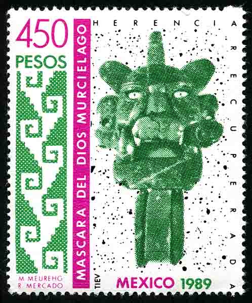 No. Scott: 1632 -- Año de Emisión: 1989 -- Valor facial: Cuatrocientos Cincuenta Pesos -- Variedad de color: Verde, Violeta y Negro -- Perforación:14 -- Tipo de impresión: Huecograbado Timbre Postal Mexicano en colores verde, violeta y Negro, del lado izquierdo de la imagen se observa una línea de grecas prehispánicas, del lado derecho aparece una máscara que representa una cara humana y encima de ella la imagen del Dios Murciélago, sobre la estampilla está escrito el valor facial de "450 PESOS", "MÁSCARA DEL DIOS MUERCIÉLAGO", "HERENCIA RECUPERADA" y "MEXICO 1989". Para más información favor de dirigirse a biblioteca@mufi.org.mx