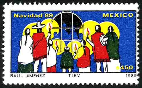 No. Scott: 1635 -- Año de Emisión: 1989 -- Valor facial: Cuatrocientos Cincuenta Pesos -- Variedad de color: Azul, Amarillo, Rojo, Verde y Negro -- Perforación:14 -- Tipo de impresión: Huecograbado Timbre Postal Mexicano en colores azul, amarillo, rojo, verde y negro, la imagen me proyecta un posada tradicional, en primer plano hay siete personas, quizá están pidiendo posada, algunas de ellas llevan velas encendidas, se encuentran de espaldas, al interior hay cuatro siluetas humanas, las cuales se observan a través de una ventana, en la parte superior está escrito "NAVIDAD 89", "MEXICO" y en la parte inferior el valor facial de "$450". Para más información favor de dirigirse a biblioteca@mufi.org.mx