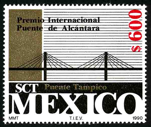 No. Scott: 1639 -- Año de Emisión: 1990 -- Valor facial: Seiscientos Pesos -- Variedad de color: Negro, Oro y Rojo -- Perforación:14 -- Tipo de impresión: HuecograbadoTimbre Postal Mexicano en colores negro, oro y rojo, al fondo de la imagen aparecen muchas líneas rectas delgadas, al frente hay tres líneas rectas y gruesas, dos son verticales y una horizontal, sobre de éstas, se observan líneas rectas en paralelo, dando forma a figuras triángulares, en la parte superior está escrito "Premio Internacional", "Puente de Alcántara", del lado lateral derecho, el valor facial de "$600" y en la parte inferior "SCT, Puente Tampico, MEXICO".