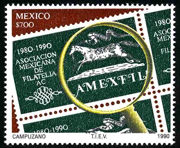 No. Scott: 1642 -- Año de Emisión: 1990 -- Valor facial: Setecientos Pesos -- Variedad de color: Verde, Café, Negro y Amarillo -- Perforación:14 -- Tipo de impresión: Huecograbado Timbre Postal Mexicano en colores verde, café, negro y amarillo, en la imagen se observa un timbre postal, resaltando con una lupa, la imagen de un caballo y la palabra "AMEXFIL" sobre el mismo timbre del lado izquierdo dice "1980-1990 ASOCIACION MEXICANA DE FILATELIA A.C.", en la parte superior "MEXICO" y el valor facial de "$700". Para más información favor de dirigirse a biblioteca@mufi.org.mx
